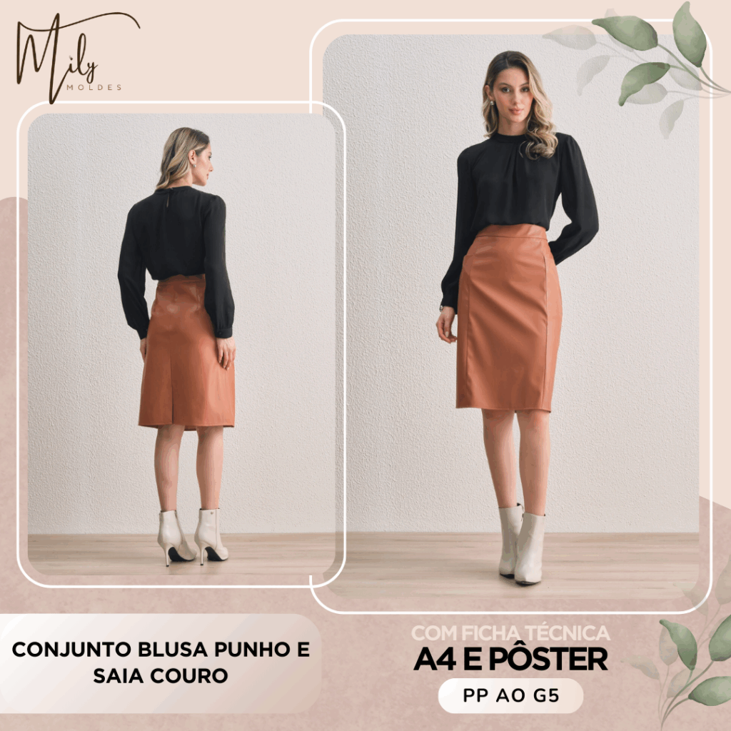 Conjunto Blusa Punho e Saia Couro [PP ao G5]