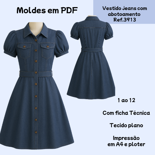 Molde infantil vestido jeans com abotoamento [2 ao 12 anos]