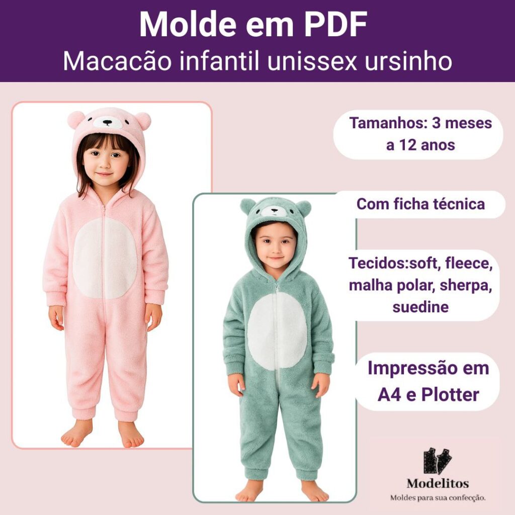 Molde em PDF Macacão Ursinho Infantil Unissex - 3 Meses A 12 Anos