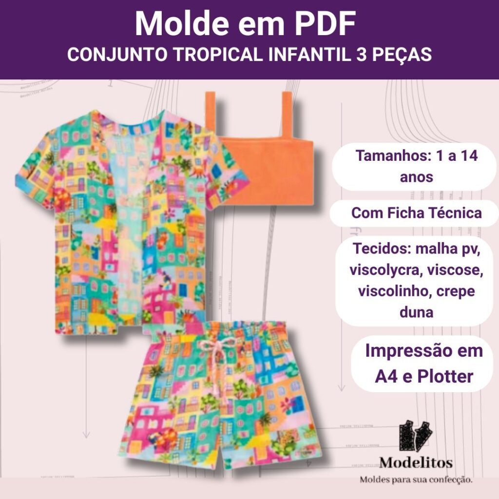 Molde em PDF conjunto tropical infantil com 3 peças - 1 a 14 anos
