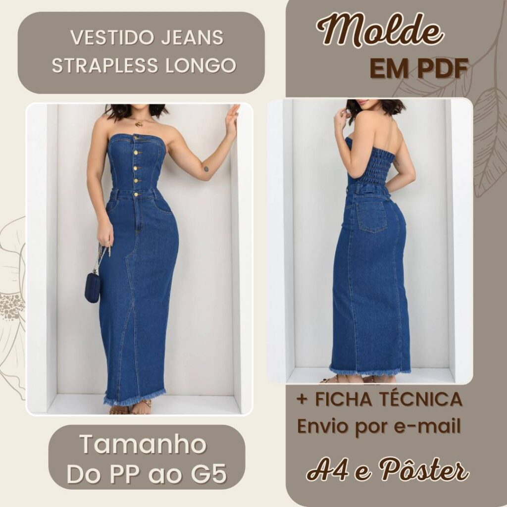 Molde em Pdf - Vestido Jeans com Strapless Longo [PP ao G5]
