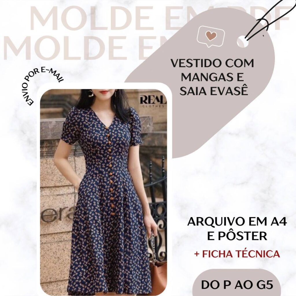 Molde em Pdf - Vestido com Mangas e Saia Evasê [P ao G5]