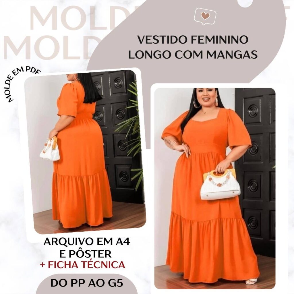 Vestido Feminino Longo com Mangas - Molde em PDF [PP ao G5]