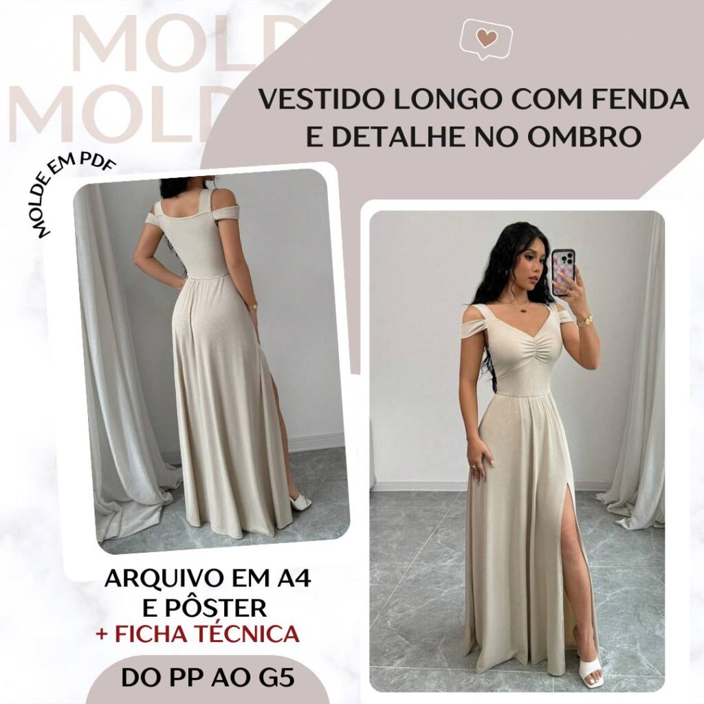 Vestido Longo com Fenda e Detalhe no Ombro - Molde em PDF [PP ao G5]