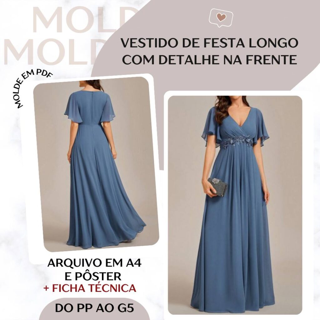Vestido de Festa Longo com Detalhe na Frente - Molde em PDF [PP ao G5]