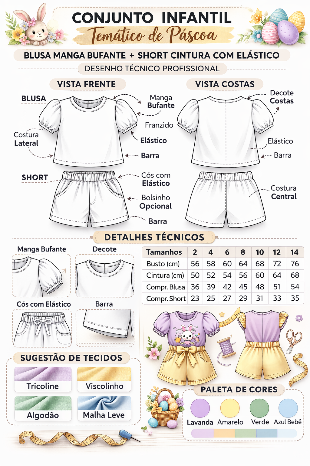 O Molde Conjunto Infantil Temático de Páscoa (2 ao 14 anos) é a escolha perfeita para quem deseja criar uma peça encantadora, confortável e altamente vendável durante a temporada mais doce do ano. Com blusa de manga bufante e short com cós elástico, esse conjunto une delicadeza, praticidade e um visual que conquista mães e crianças à primeira vista.